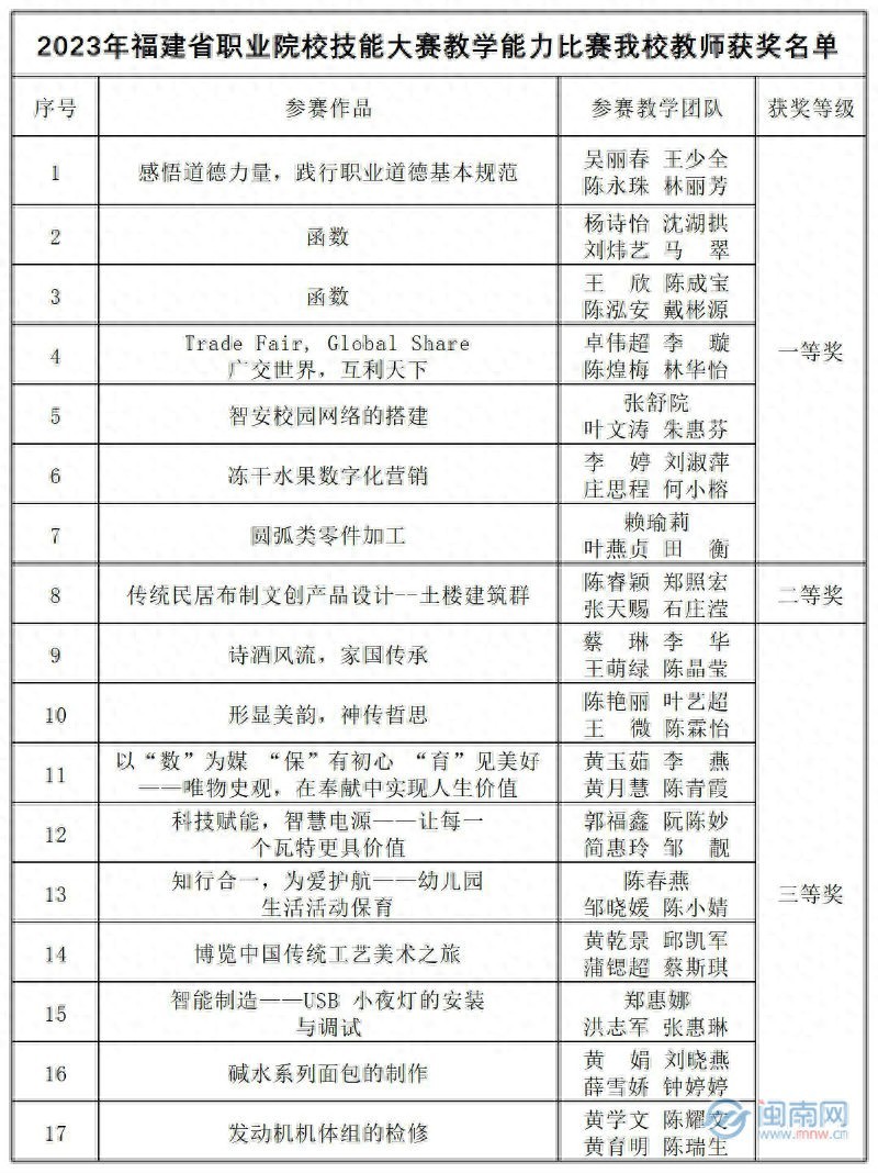 闽南网7月31日讯(通讯员 连小铃 杨诗怡 闽南网记者 周怡楠 文/图)近日,2023年福建省职业院校技能大赛教学能力比赛决赛在莆田市湄洲湾职业技术学院举办。经过激烈角逐,漳州第一职业中专学校(以下简称“漳州一职校”)参赛团队获得一等奖7项、二等奖1项、三等奖9项的优异成绩。获奖总成绩连续三年位列全省中职校第一。