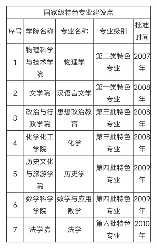 广西师范大学国家特色专业有7个,分别是物理学、汉语言文学、思想政治教育、化学、历史学、数学与应用、法学。
