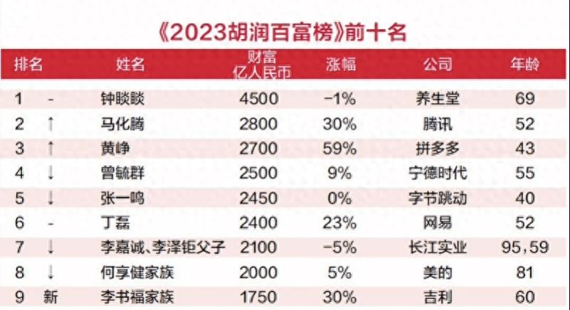 2023胡润百富榜发布:钟睒睒连任中国首富,腾讯马化腾位居第二,拼多多黄峥首次进入前三2023年10月24日,备受瞩目的胡润百富榜如期发布。此次榜单共有1241位个人财富达到50亿元人民币以上的企业家上榜。与去年相比,今年上榜人数减少了64人,总财富下降了4%至23.5万亿元。尽管如此,仍有522位企业家的财富较去年有所增长。在榜单上的前三名分别是农夫山泉的钟睒睒、腾讯的马化腾和拼多多的黄峥。钟睒睒以4500亿元的财富连任中国首富,马化腾的财富增长了30%至2800亿元,黄峥的财富增长最多,达到2700亿元。在本年度的胡润百富榜上,农夫山泉创始人钟睒睒以4500亿元的财富再次成为中国首富。尽管其财富与去年持平,但他的公司在今年上半年表现出色,股价未受香港证券市场整体下行的影响,业绩基本持平。此外,公司还受益于港币汇率的上涨以及大额分红,财富比去年有所增长。
