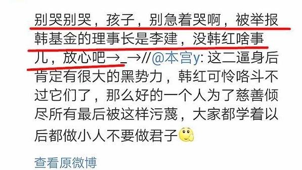面对网络上的质疑声音,举报人司马3忌则明确表示,“别哭别哭,孩子,别着急哭啊,被举报韩基金的理事长,没韩红啥事儿,放心吧。”从他的话中,似乎是直接将韩红从举报中摘了出去,但民众还是非常不满。