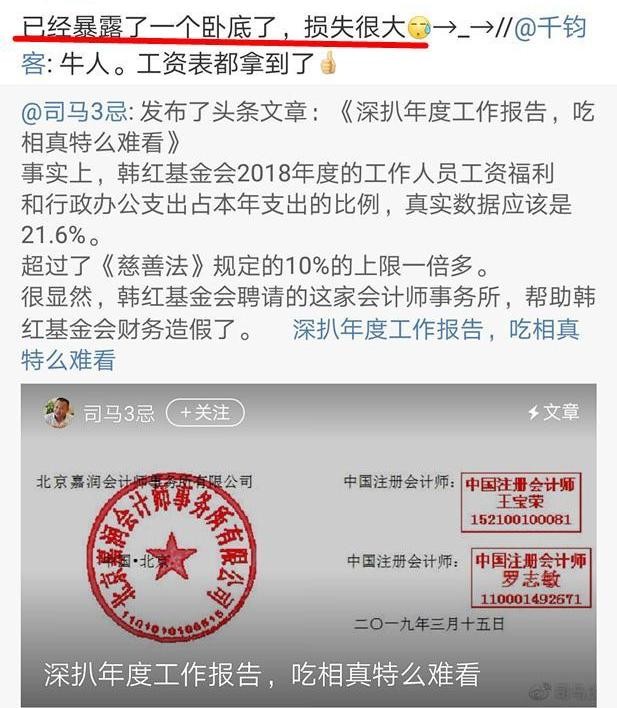 很多人都非常诧异,这个举报人司马3忌怎么会这么厉害,竟然能拿到韩红基金会这么机密的文件?对此举报人司马3忌声称“已经暴露了一个卧底了,损失很大。”