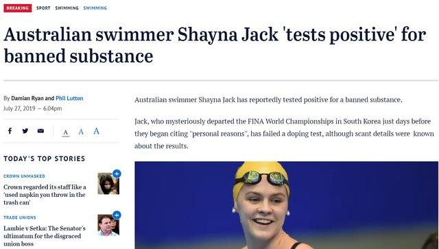 北京时间7月27日,根据澳大利亚《悉尼先驱晨报》《9NEWS》等多家媒体曝出重磅消息,在世锦赛开始之前,澳大利亚游泳女将Shayna Jack在接受药检时被检测出呈阳性,因此她在最后时刻退出了本届世锦赛。目前,澳大利亚游泳队拒绝回应她退出的原因。