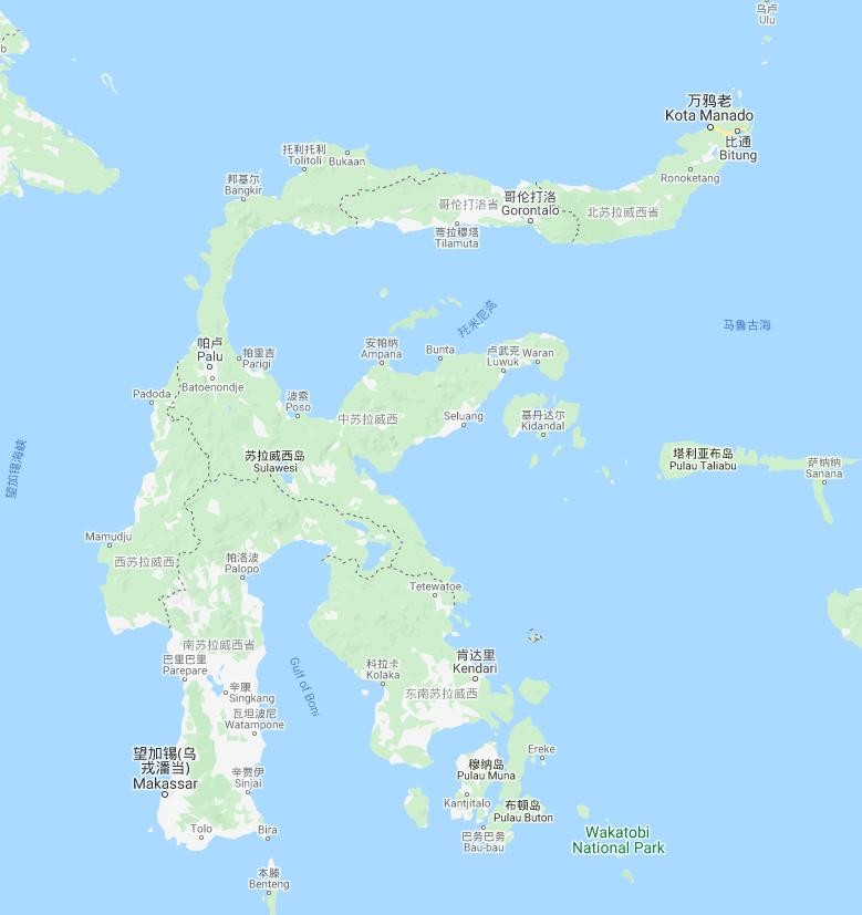 苏拉威西岛位于印度尼西亚中部,赤道横穿而过,面积大约为17.5万平方千米,人口约2000万人。苏拉威西岛形状独特,像一个”K”字,四个半岛分别向南方、东南、东北和北方延伸出来,其内部多高山峡谷,因此很多时候水运比陆运更方便。