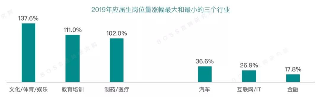 同时,BOSS直聘发布的《2019年应届生求职趋势报告》显示,制药/医疗行业的岗位量涨幅102%,排第三,仅次于文化/体育/娱乐行业和教育行业。