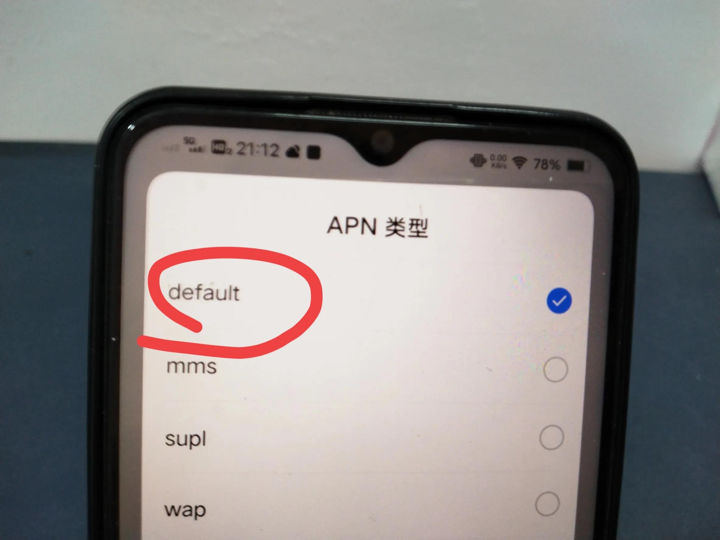 第三步设置 APN 类型,选择 default。然后点击确定。(如上图所示)