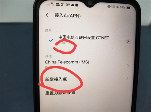 进入页面后,可以看到中国电信互联网设置,ctnet 是默认设置,我们可以选择这里的新增接入点。(如上图所示)