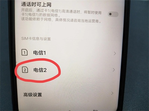 进入此页面后往上滑,滑到底部,找到要设置的卡,如电信 2 卡,点击进入。(如上图所示)