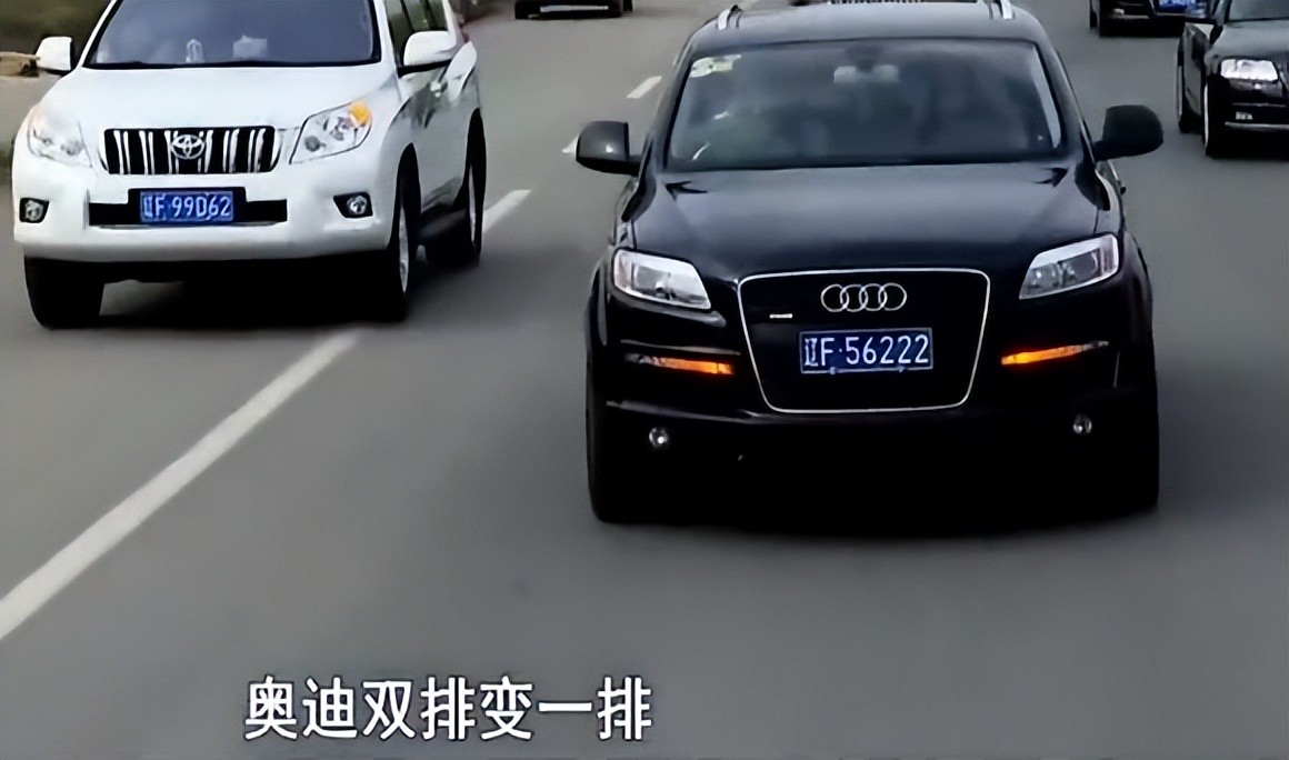 “走随便上,奥迪16台,马上出发,走!开车千万注意安全,双闪打开,奥迪双排变一排,整个把道占满,奥迪往前冲,往前冲!”