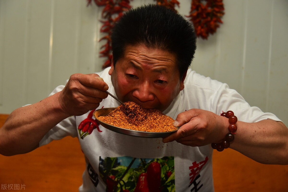 根据统计,他平时一天要吃至少5斤辣椒。有时候嫌不过瘾,还要配上大蒜和高浓度白酒等辣味食品开胃。
