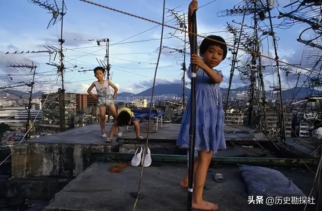 由于城寨的楼越建越高,留给居民活动的空间也越来越少,很多小朋友会爬到屋顶玩耍,楼上同样密密麻麻的布满了天线。