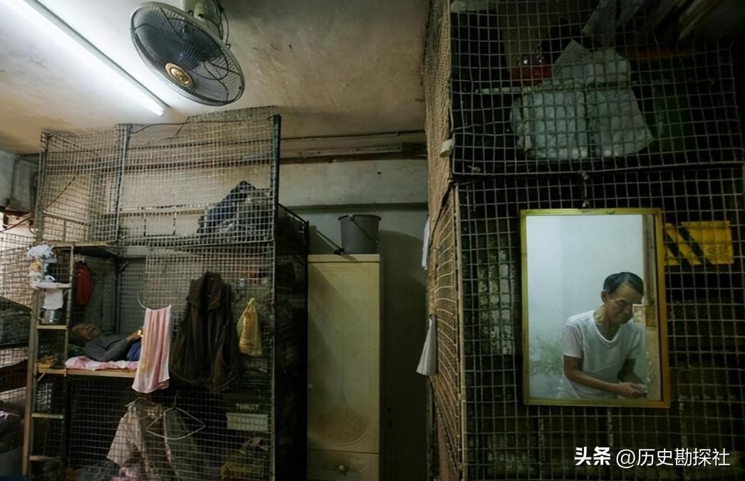 房间内有一个悬挂的电风扇,一些衣物挂在铁丝网上,密密麻麻的铁丝网划分开了一个人的生活区域,看起来跟监狱没什么区别。