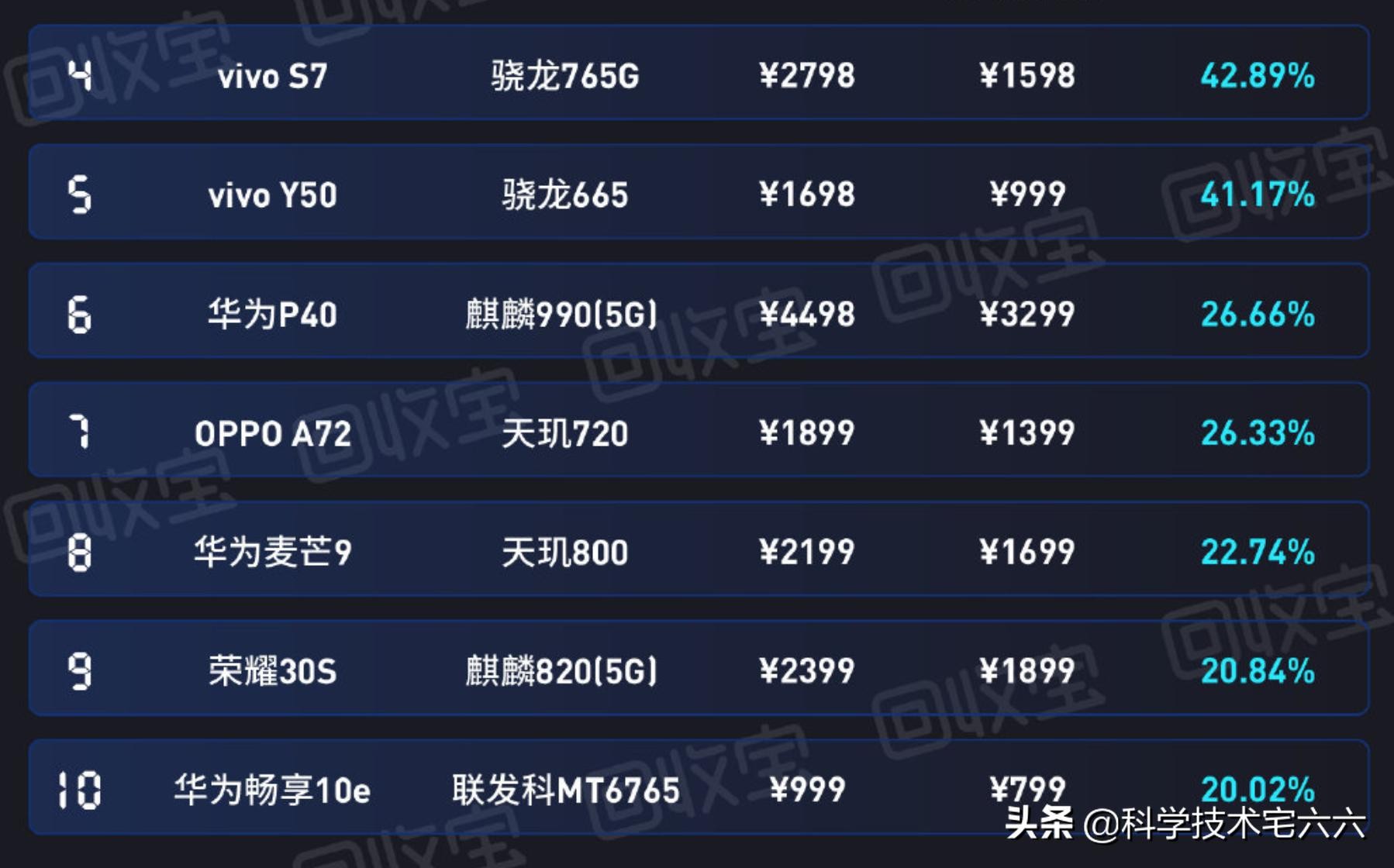 第二名是vivo X50,第三名是OPPO Reno4,第四名为vivo S7,这三款机器均搭载骁龙765G处理器;同样骁龙765G处理器手机——iQOO Z1x的上市价格只有1598元,有趣的是这款机器是vivo旗下的产品;不过还是那句话,买手机不能只看芯片,iQOO Z1x除了芯片之外,其他方面的表现并不出色。