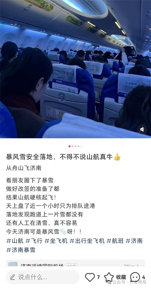 小红书网友分享,“对山航的刻板印象加深了”,本来以为飞不了,没想到还是安全落地济南。