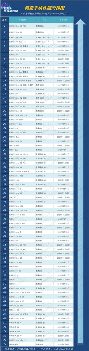 2023年8月29日开始,华为未经发布即陆续对最新旗舰手机HUAWEI Mate 60系列进行发售,为给小伙伴们提供清晰可视化的参考工具,特修正《鸿蒙手机性能天梯图:华为手机性能排行榜》,数据最后统计日期为2023年9月1日。