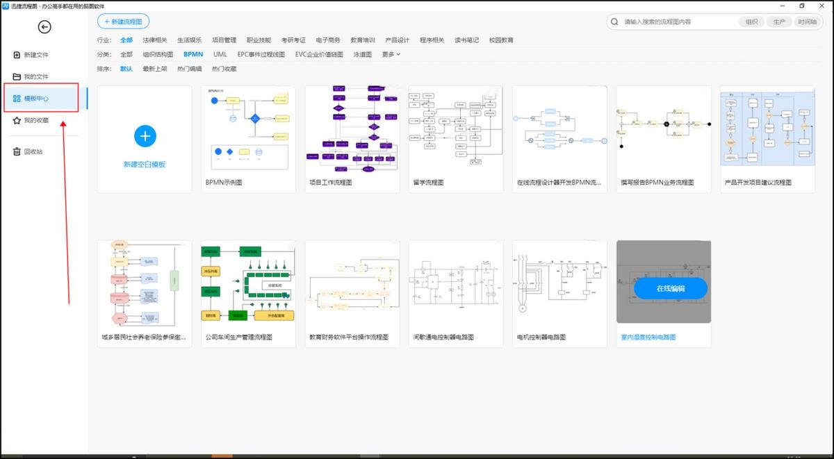 在制作甘特图之前,我们先要选择一个制作工具帮助我们进行制作。比如说,我们可以选择使用【迅捷流程图】。这是一个制作流程图的工具,里面不仅提供了很多制作流程图常常用到的一些核心元素,还提供了很多不同类型的模版供大家使用。
