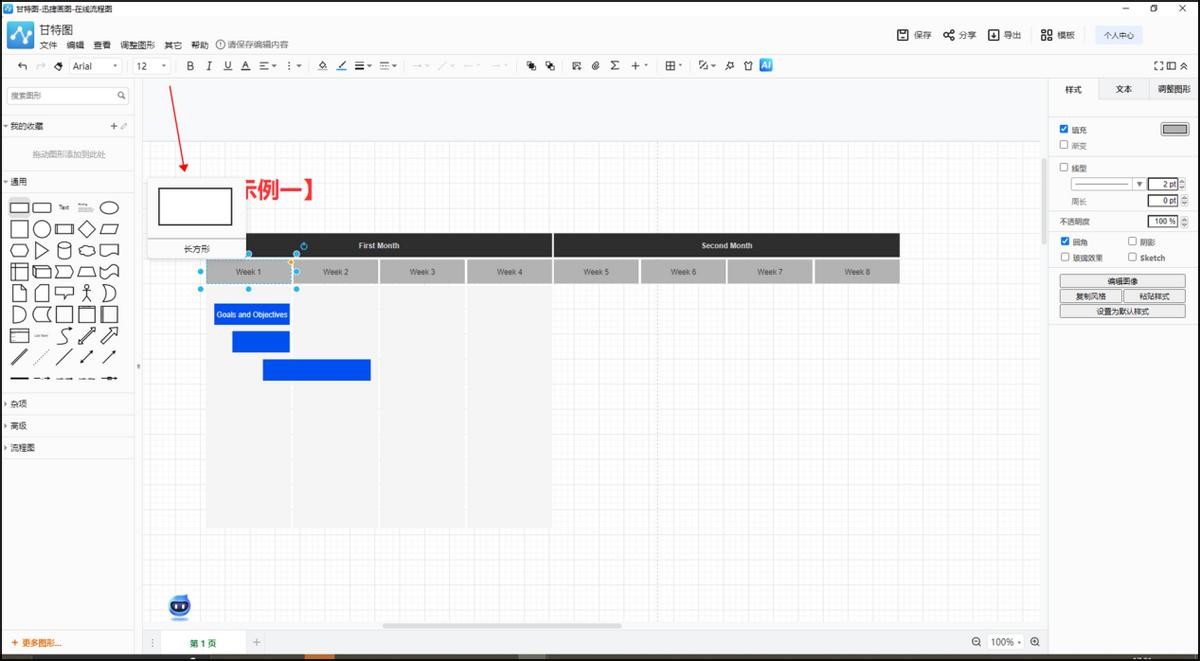 接下来,我们需要确定项目的任务和时间范围。确定好之后,点击左侧的图形工具栏进行添加,可以添加矩形,然后编辑任务内容和时间范围就可以了。