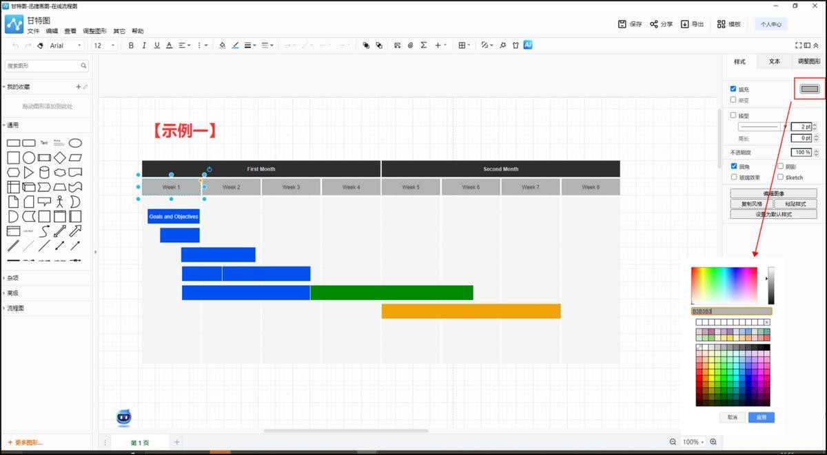 编辑好甘特图的大概内容之后,可以使用不同的颜色或标记来表示它们。点击其中的一个矩形框之后,可以选择添加不同的背景颜色。