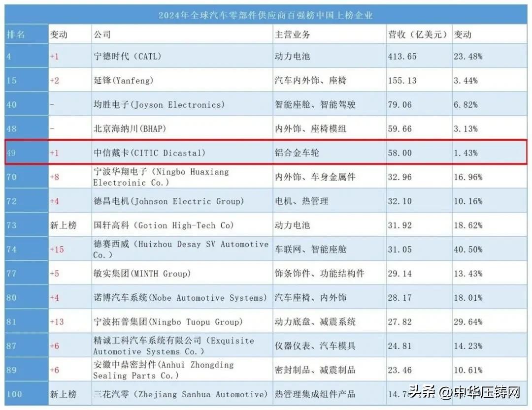 根据世界权威汽车媒体《美国汽车新闻》(Automotive News)发布的2024年全球汽车零部件供应商百强榜里,中国共有15家企业上榜。作为首家跻身全球汽车零部件百强的中国本土企业,中信戴卡连续13年上榜,以58亿美元(约合人民币422亿元)营收排名第49位,较上一年度前进1位,创下历史最好排名。