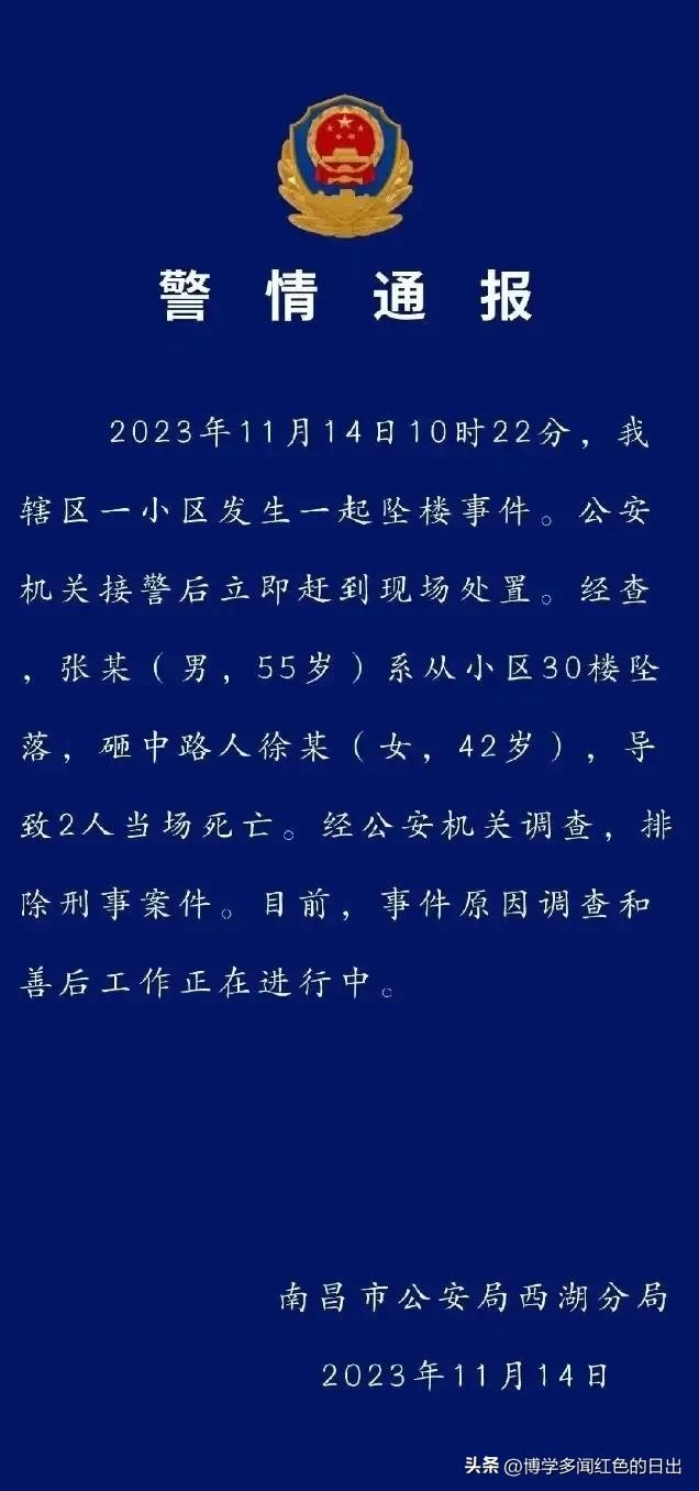 2023年11月14日,一则江西南昌朝阳恒大华府小区一男子坠楼砸死路人事故,引起广泛关注。当天下午,突然传来一声巨响。一名55岁的男子张某,从小区的30楼坠落,不幸砸中了一名42岁的女性路人徐某,导致两人当场死亡。这起事件引起了社会的广泛关注和热议。
