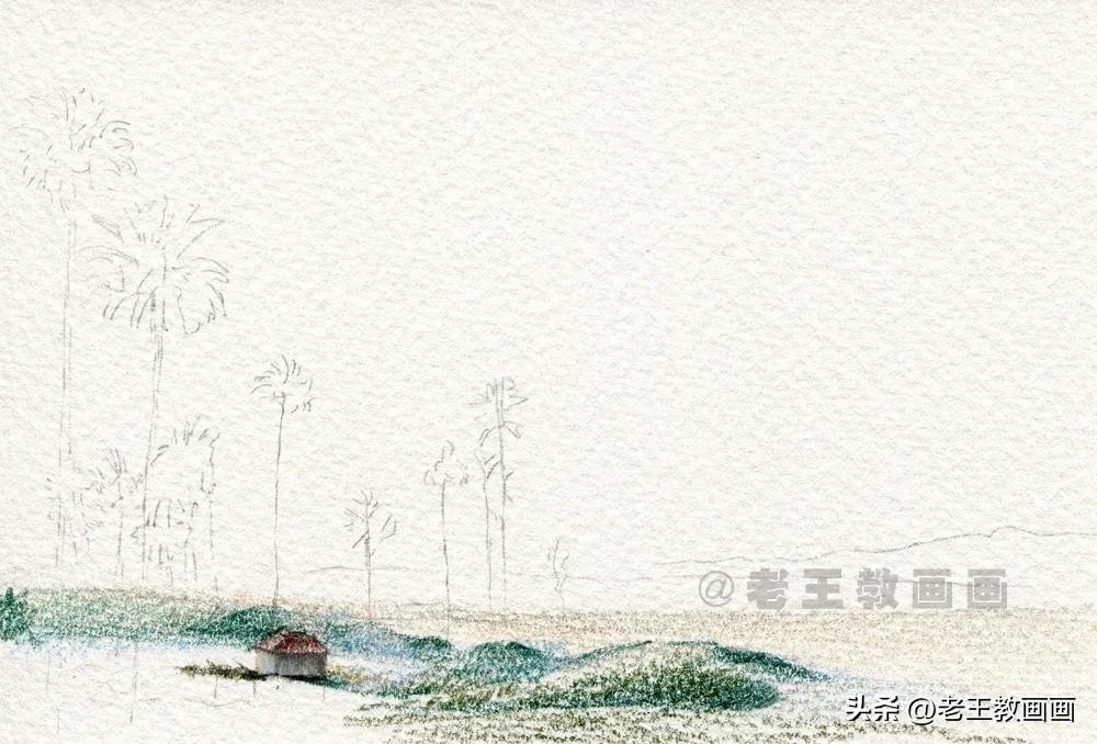 >>>【第1步】:画前分析,画彩铅风景不用死磕细节,画出大的色彩关系就可以。用铅笔轻轻的起型打底稿,根据纸张的大小确定风景中树、地面和海面的比例位置(p1)↓