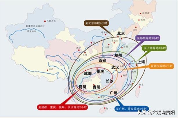 贵广、沪昆、渝黔、成贵高铁等铁路建成,让贵阳乃至贵州快速融入全国主要经济区2—7小时经济圈。以贵阳为中心,这个经济圈向南包括北部湾、珠三角经济区,向东包括长株潭、长三角等城市经济圈,向西包括滇中经济区,向北包括成渝、关中、中原、环渤海经济区。届时,将实现贵阳至昆明、重庆、长沙、成都2至3小时内到达,至广州、武汉、南昌4小时内到达,至上海6小时,北京7小时内到达。