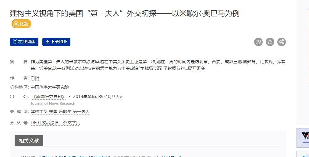 参考资料:[1]白阳.建构主义视角下的美国“第一夫人”外交初探——以米歇尔·奥巴马为例[J].新闻研究导刊,2014,5(6):39-40