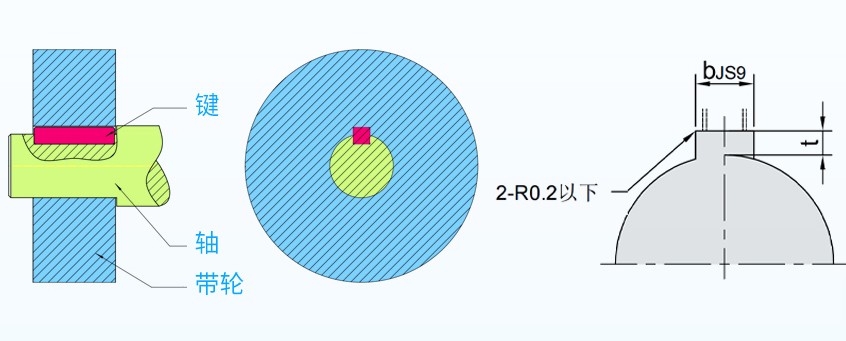 普通型同步带轮常见安装方式为键连接,其结构简单、拆装方便、对中性好,应用广泛。此外,键槽孔还常搭配顶丝孔使用。顶丝孔是固定轴和键的螺丝孔,通常通过拧入顶丝达到固定轴和键的作用,减少因公差产生的相对滑动,在设备大修或其他需拆卸零件时,将顶丝拧松以分离带轮和轴。