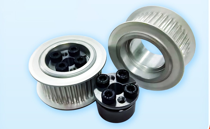 免键型同步带轮就是无键安装,可以减少轴的加工时间,同时减少了轴的切削,对强度影响较小,无需专用工具维护,拆卸简单,重复利用率高,可有效降低成本。免键型同步带轮使用的胀紧套是一种无键联结装置,其原理是通过高强度拉力螺栓的作用,在内环与轴之间、外环与轮毂之间产生巨大抱紧力,实现机件与轴的无键联结。