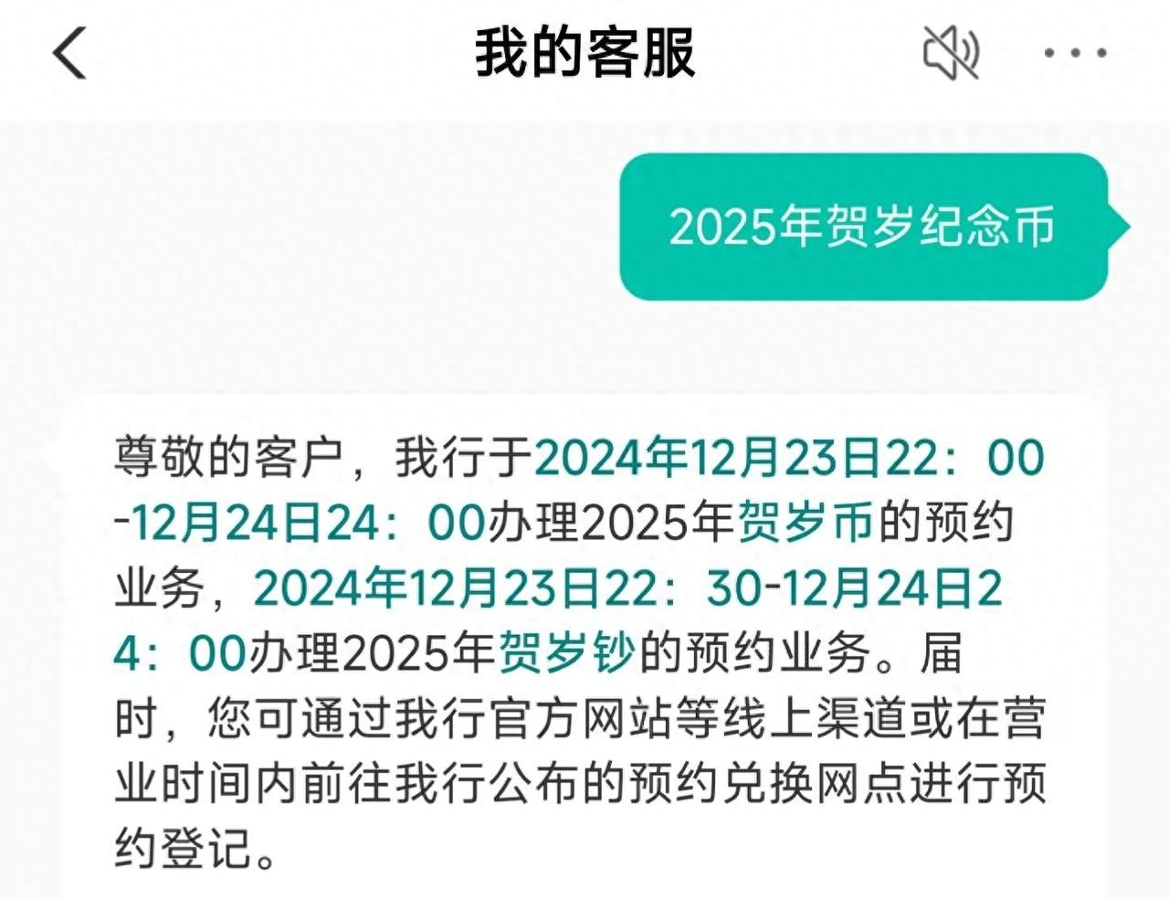 中国农业银行咨询页面显示,该行将于12月23日22:00-12月24日24:00办理2025年贺岁币的预约业务,2024年12月23日22:30-12月24日24:00办理2025年贺岁钞的预约业务。届时,有需要者可通过该行官方网站等线上渠道或在营业时间内前往公布的预约兑换网点进行预约登记。