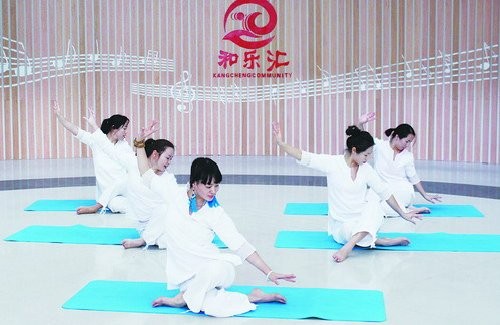 社区书院成为邻里展示才艺的舞台,图为康城社区书院居民进行瑜伽教学。(王晗 摄)