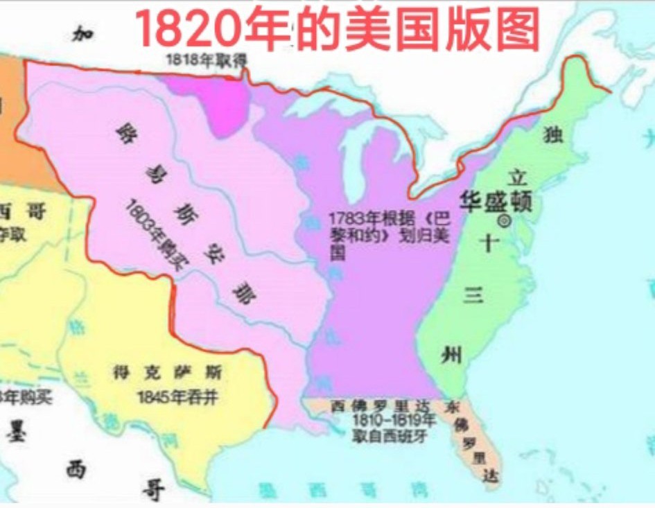 在1783年的和约中,英国除了承认北美十三州独立外,同时也承认阿巴拉契亚山以西,五大湖以南,密西西比河以东的原英属殖民地归属于美国。19世纪初,稳定下来的美国开始向外扩张。1803年,利用法国在拿破仓战争中的困境,以1500万美元的价格,从法国手中购得密西西比河西岸地区路易斯安那。1810-1819年,美国以渗透,武力威胁,以及金钱收卖等方式,从西班牙手中取得佛罗里达地区。1818年,美国取得密西西比河上游原美英争议地区。至此,美国的领土相比建国之初整整扩张了一倍。