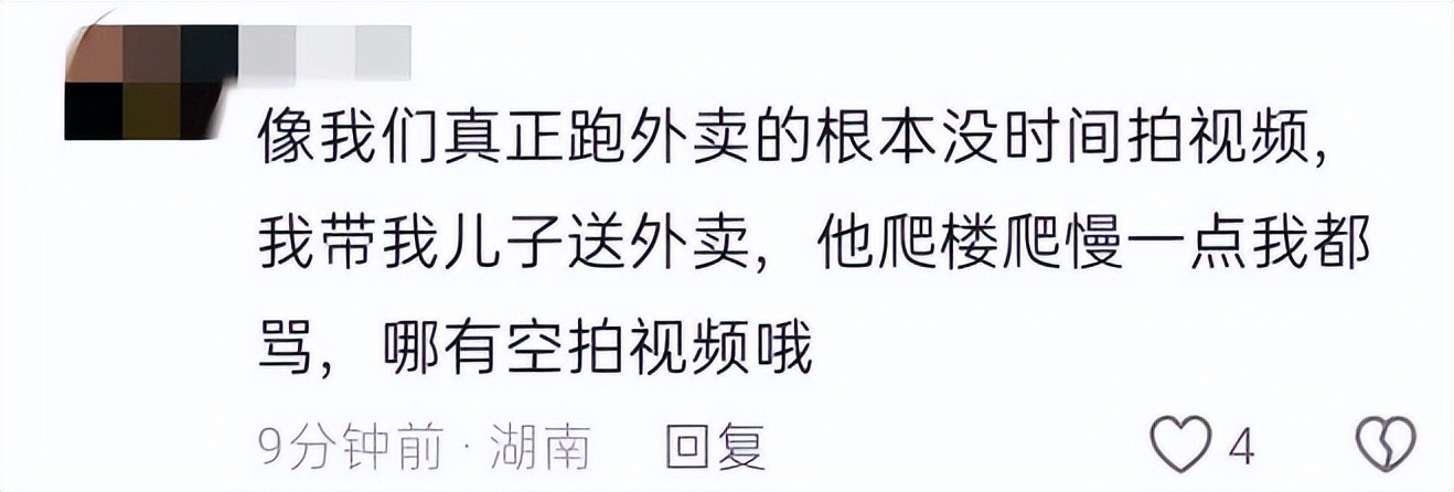 一些真正的外卖骑手站出来还原真相:像我们真正跑外卖的根本没时间拍视频,我带我儿子送外卖,他爬楼爬慢一点我都骂,哪有空拍视频哦。
