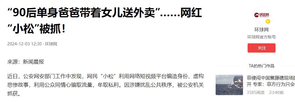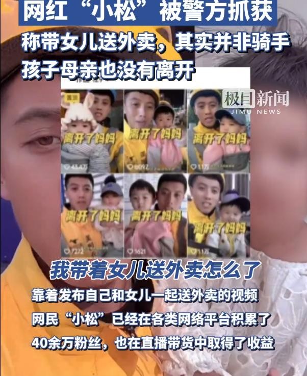 信息来源:环球网 2024-12-3 “90后单身爸爸带着女儿送外卖”…….网红“小松”被抓!
