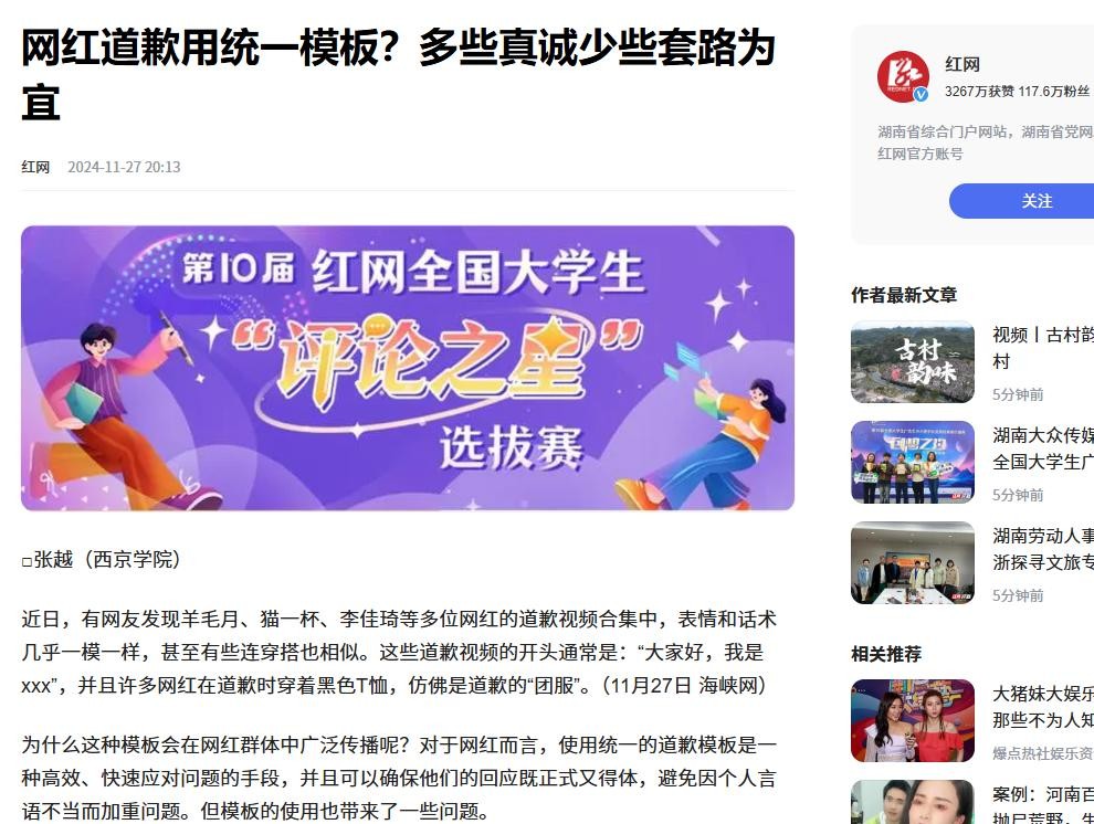 信息来源:红网 2024-11-27 网红道歉用统一模板?多些真诚少些套路为宜