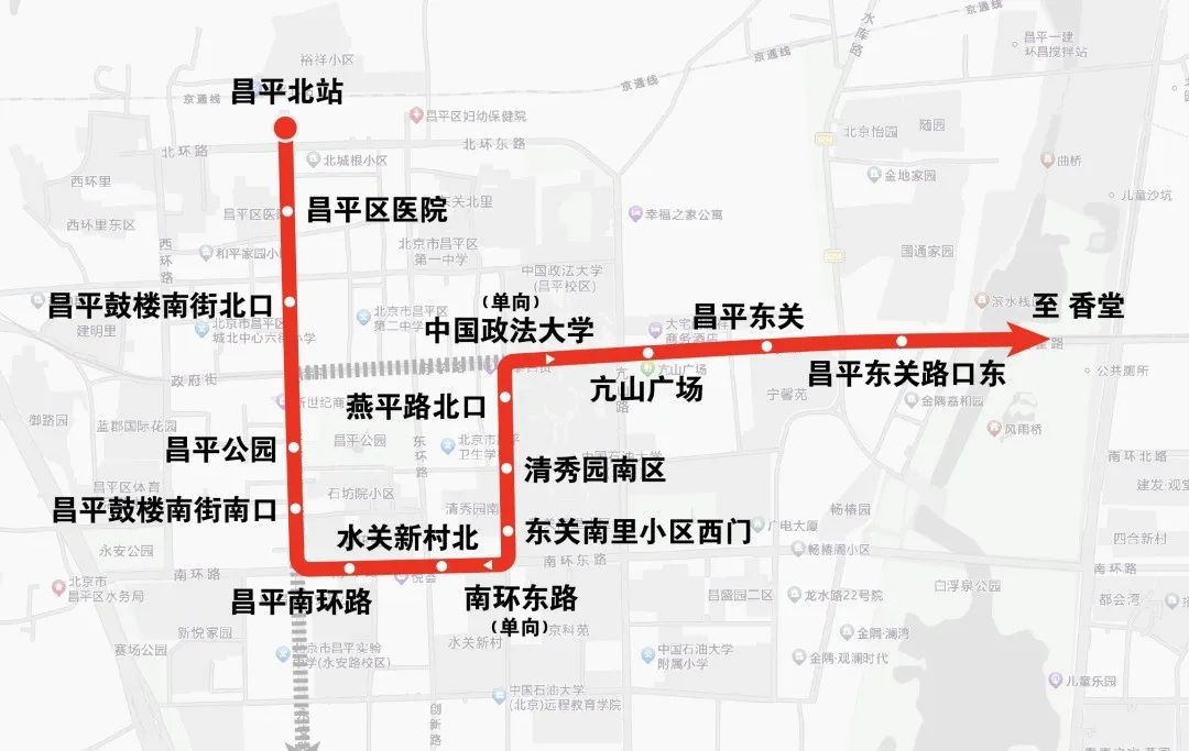 增设燕平路北口、清秀园南区、东关南里小区西门、南环东路(开往昌平北站方向单向站)、水关新村北、昌平南环路、昌平鼓楼南街南口、昌平公园、昌平鼓楼南街北口、昌平区医院、昌平北站站点。(注:调整后中国政法大学站仅昌平北站开往香堂方向单向停靠)