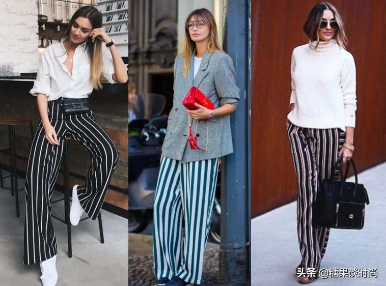 黑色的裤子显瘦,而条纹的阔腿裤视觉上拉伸腿长,让你看起来更高一些。这样的竖条纹风格阔腿裤,是很多年轻人喜欢的范儿,搭配起来也比较简单,夏季搭配上衬衫,冬季可以内搭毛衣,美美的造型,怎能不叫人喜爱。