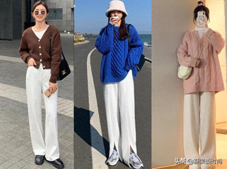 无论是奶白色、米白色,都是百搭的颜色。搭配得当的话,绝对是气质加分哦,让我们看一下这三款搭配方式。第一款适合春秋时节穿,咖啡色的开衫配上白色的阔腿裤,垂直感十足,配上一双黑色的小皮鞋,非常的好看。第二款与第三款搭配类似,都是毛衣搭配阔腿裤。高腰的设计,让人看起来显高,小个子也能轻松驾驭。