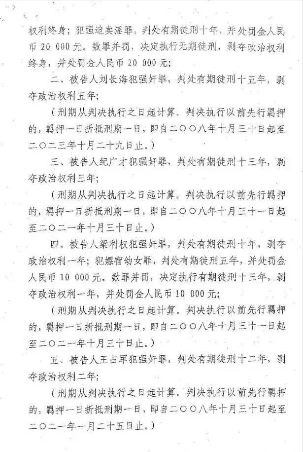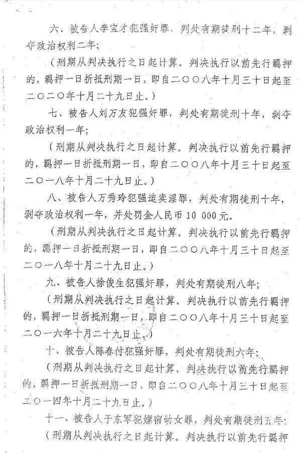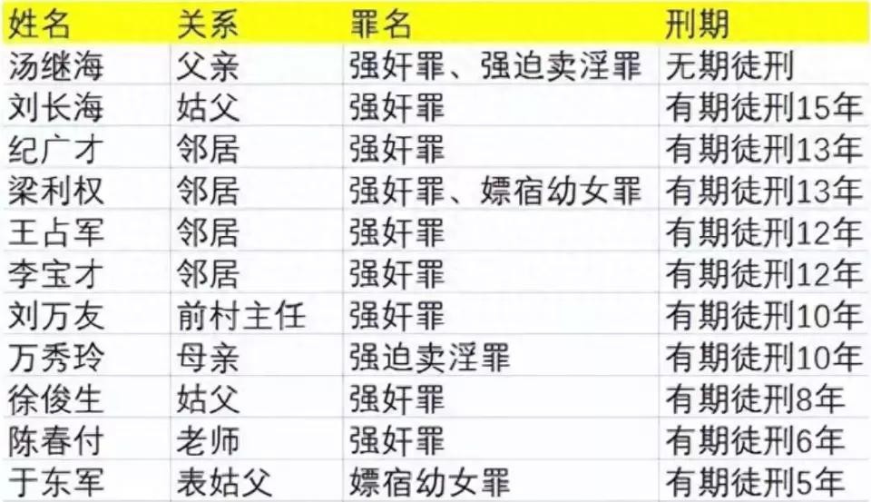 其中11名被告均获刑,其中10人犯强奸罪,汤兰兰的父母都犯有强迫卖淫罪,其父被判无期徒刑,其母被判有期徒刑10年。