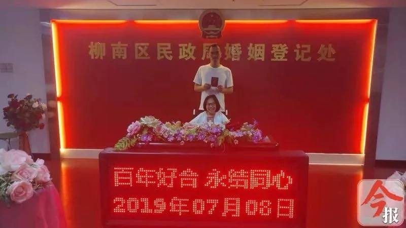 7月8日,“走心情侣”丁一舟和赖敏在柳州市柳南区民政局婚姻登记处领取了结婚证,正式步入婚姻殿堂,同时,他们这段传奇的“走心之旅”也画上了句号。