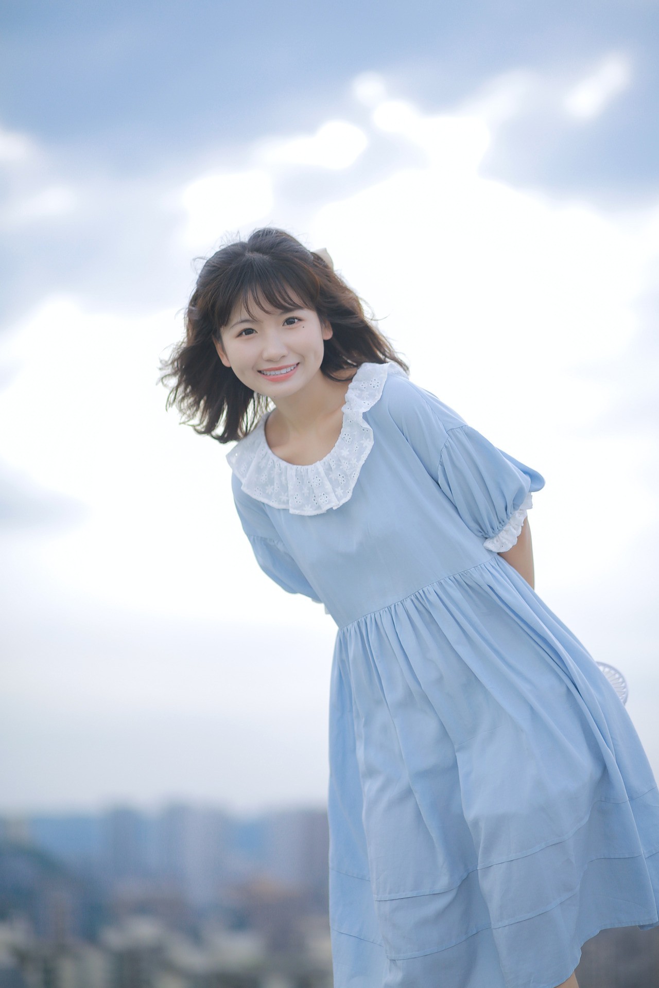 拍照露出双手会无所适从?不妨把手藏起来,以天空为背景,低角度仰拍,指导模特将双手放于背后,让自己从画面的一侧探出身来,清新好看的同时又带有俏皮的感觉。