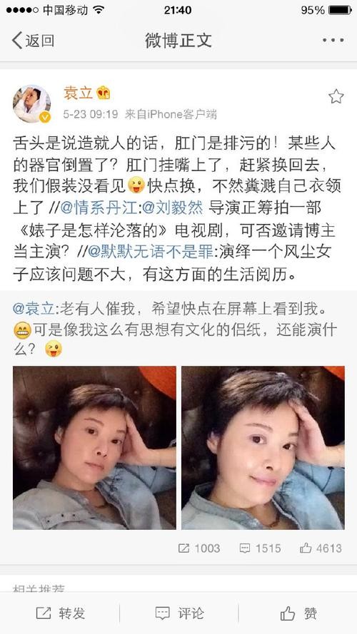 但就是不知道这是袁立为了逃避话题的手段,还是她确实知道些什么内情,反正此消息一出,斯琴高娃和袁立都被骂的狗血淋头,甚至还有人说袁立的精神有问题。