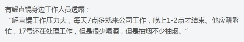 “解直锟的工作压力很大,每天早上7点多就来公司工作,晚上1、2点才结束。”