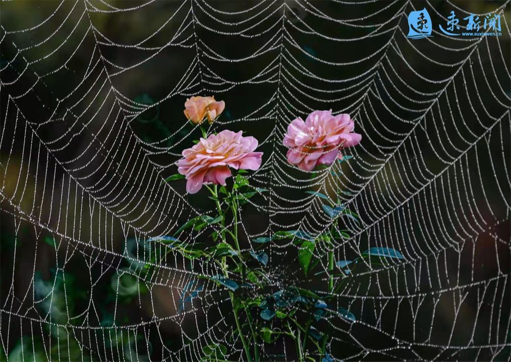 入秋后,花乡沭阳的一株株月季散发芳香。透过相机的镜头,蛛网织锦,雾气升腾,芳香流动……按下快门的瞬间,每一个视角,如梦如幻,召唤着远方的朋友,共赴花乡9月底的这一场花木盛会。(丁华明 摄)