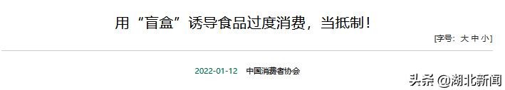 1月12日,中国消费者协会在其官网发布《用“盲盒”诱导食品过度消费,当抵制!》的文章: