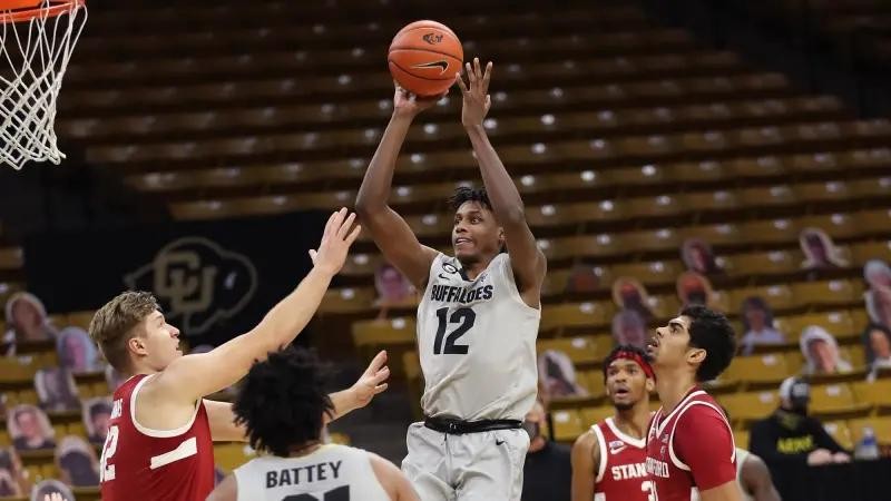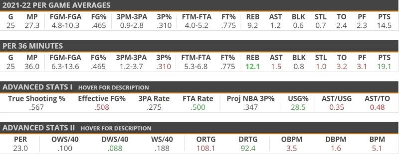 贾巴里在2021年的三分命中率只有24%,合计一共37投9中,但是在2022年贾巴里的三分一共38投14中,命中率38%,命中率比较稳定并且在近5场都有三分进账,贾巴里-沃克的罚球命中率很好,自1月16号以来,贾巴里一共罚了60次罚球,只罚丢了5记,罚球赛季命中率接近80%,并且他已经连续命中27记罚球,他的罚球姿势没有问题手感也非常柔和,我们有理由相信他的三分可以稳定。在科罗拉多大学的战术体系中贾巴里承接了很多pnp的任务,这也让他练就了一手能在切入和外弹3分间进行合理选择的能力,她能够很好的把握住切入的时机,而不是一味地在外线等着后卫给你做球,在现代空间篮球中这是非常遇到的。