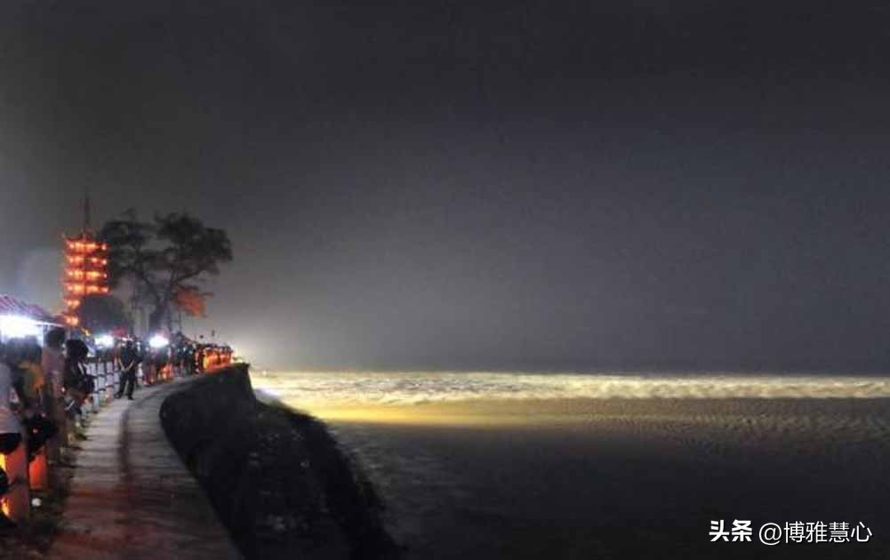 “一千里色中秋月,十万军声半夜潮。”这是唐代诗人李廓笔下的钱塘潮夜色。钱塘夜潮有何特别?钱塘潮水裹挟着月光从天际奔涌翻腾而来,带着高深莫测的神秘感,低沉而又有力量。很多人以为夜晚的江河早已归于平静,但是钱塘潮可不止是白天才有,钱塘潮在一天当中会分别出现两次,一次在白天一次在晚上,相隔约12个小时。白天观潮,看的是钱塘潮的壮美气势;夜晚观潮,看的是钱塘潮的静谧与深沉。