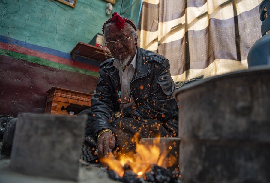 在拉孜县柳乡孜龙村,次旦旺加在制作藏刀(3月10日摄)。新华社记者 孙非 摄