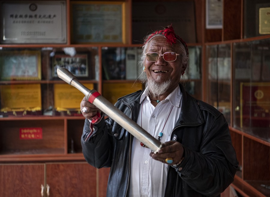 在拉孜县柳乡孜龙村,次旦旺加在展示制作完成的孜龙藏刀(3月10日摄)。新华社记者 孙非 摄
