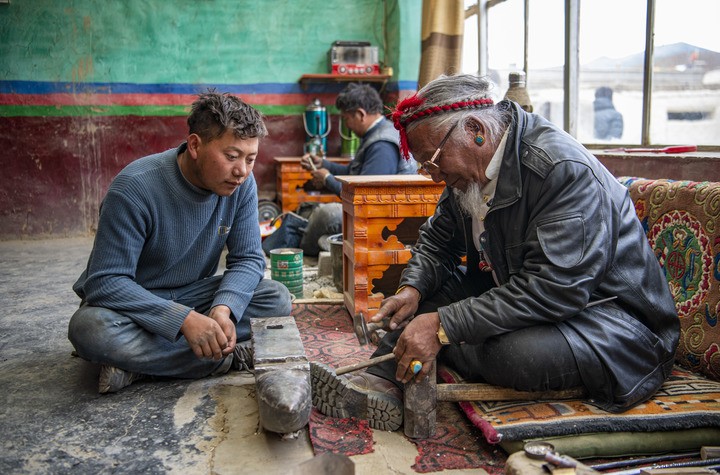 在拉孜县柳乡孜龙村,次旦旺加(右)在指导孙子制作藏刀(3月17日摄)。新华社记者 孙非 摄