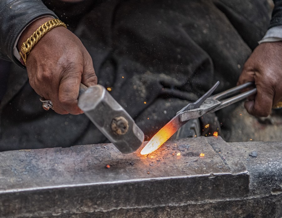 一把30厘米长的藏刀,祖孙三代四人合作,最快也要三天才能完成。